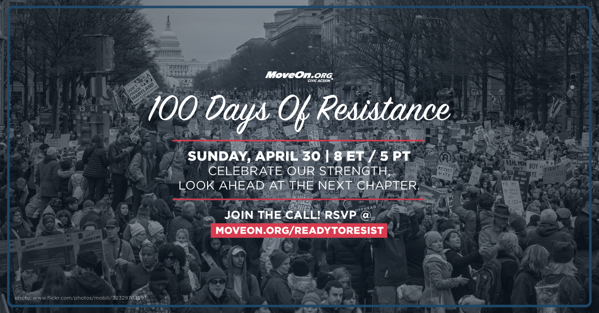 This Sunday marks 100 days in office for Donald Trump—a key stock-taking moment to see how an administration has done out of the starting gates. That's why we've planned a special "100 Days of Resistance" movement call this Sunday to reflect on our victories, lessons we've learned, and how we can trade in our sprinting spikes for marathon shoes, as MoveOn Executive Director Anna Galland recently put it!1